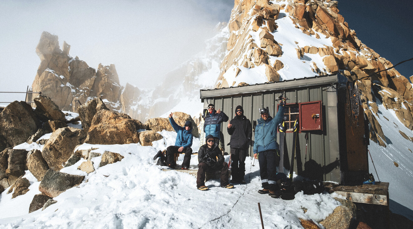 Photo (left to right): Sam Favret (freerider), Johann Vienney (blue jacket, guide), Maxime Moulin (black jacket with camera, director), Fabian Bodet (photographer), Hensli Sage (drone cinematographer)